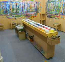 Im Atelier empfängt Sie der Geruch von frischer Farbe. Der Mal-Raum ist ein Ort der Stille. Er ist fensterlos, damit keine äusseren Einflüsse stören. Die hohen Malwände vermitteln Sicherheit und Geborgenheit. Sie malen, wenn möglich, stehend vor der Mal-Wand. Erwachsene malen mit der Hand direkt auf das Blatt (es können auch Pinsel verwendet werden). Kinder und Jugendliche malen mit Pinseln. Durch den direkten Kontakt mit den Farben und dem Blatt wächst eine Verbindung zwischen Ihnen und dem Bild.